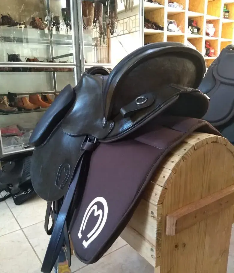 Sela mangalarga 14 polegadas+ manta profissional de luxo top Sela completa em 14 polegadas, fabricada em couro de búfalo, armação em fibra epóxi. "Ferragens em Aço inoxidável". Suadores em feltro. Assento e borrainas em couro (Vaqueta), com espuma de alta densidade (D60).